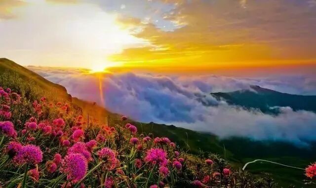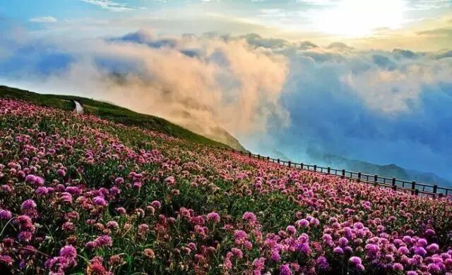 每年八九月份,韭菜花盛开,花形如球状点缀在群山与云雾之间,犹如波浪般随风翻滚,形成花的海洋,色彩斑斓,香气缭绕,登高览花,芳香扑面。登上韭菜坪,头顶蓝天,放眼望去,起伏的山丘上数万亩野韭菜花竞相开放,漫山遍野的紫色球状韭菜花,点缀在万亩绿色草叶之间,灿烂、辽远,让人心旷神怡,阿西里西大草原,美丽景色丝毫不逊色于蒙古大草原。这里野花遍野,云雀高飞,牛羊成群,牧歌阵阵,好一派草原景象!