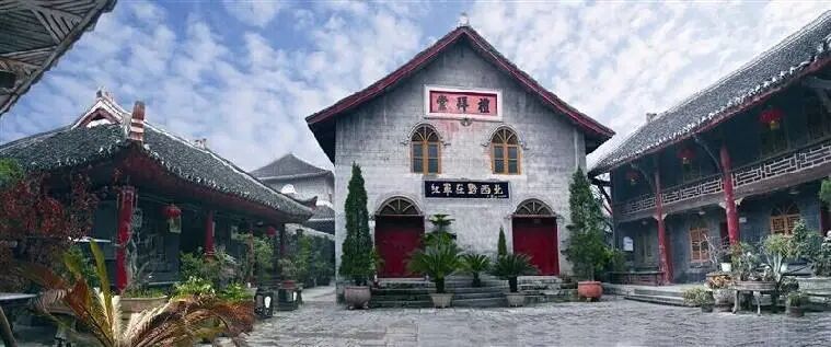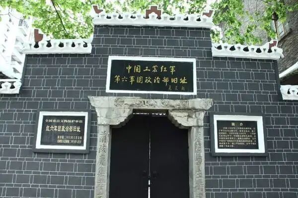 红六军团政治部旧址位于中山路,几棵梧桐树遮掩着一处幽静的院落,建于民国五年,原为安息会,坐北向南,占地面积为962.5平方米,由正厅、两厢组成,为歇山式木结构建筑。幽幽院落,青石地板,各种盆景点缀其间,茂盛的绿意和红色的廊柱、门窗交相辉映,青瓦飞檐,古朴肃静,连接着久远的时空……